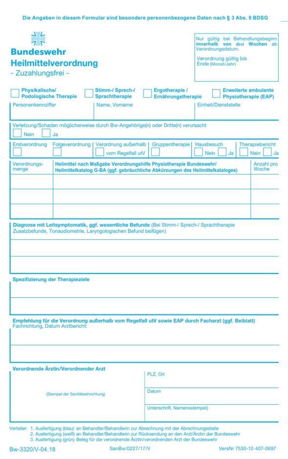 „Aktuell entsprechen die Unterbrechungstatbestände für Patienten denen des vdek-Rahmenvertrages. Bei einer Unterbrechung, die länger als 14 Tage andauert, ist der Grund für die Unterbrechung auf der Rückseite der Heilmittelverordnung schriftlich aufzutragen (Z.B. „Krankheit des Patienten“). Bitte verwenden Sie hierbei nicht die sonst üblichen Abkürzungen, da die Abrechnungsstelle der Bundeswehr diese nicht akzeptiert.“