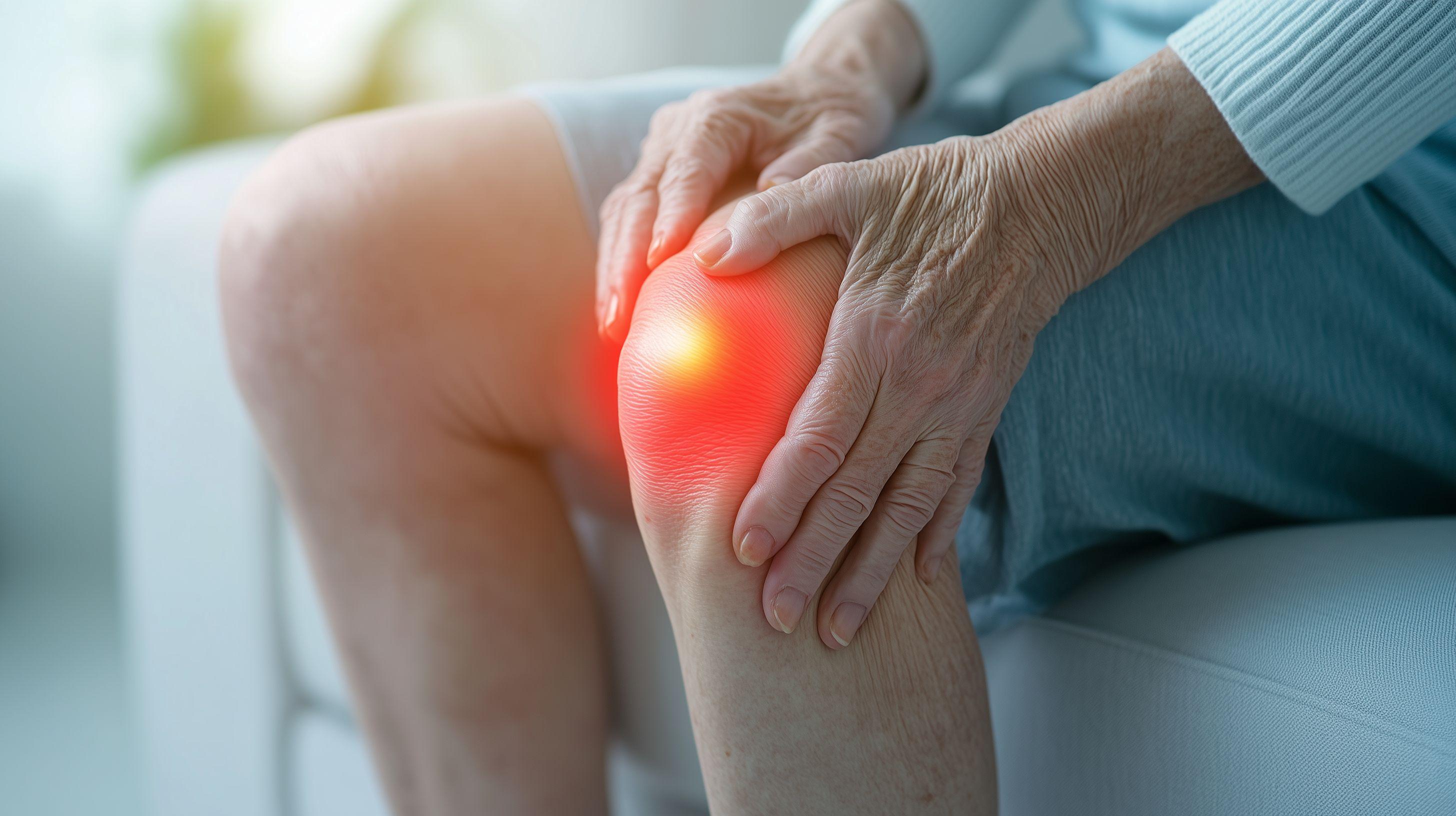 Alte Frau mit Knieschmerzen hält ihr steifes, schmerzendes Knie