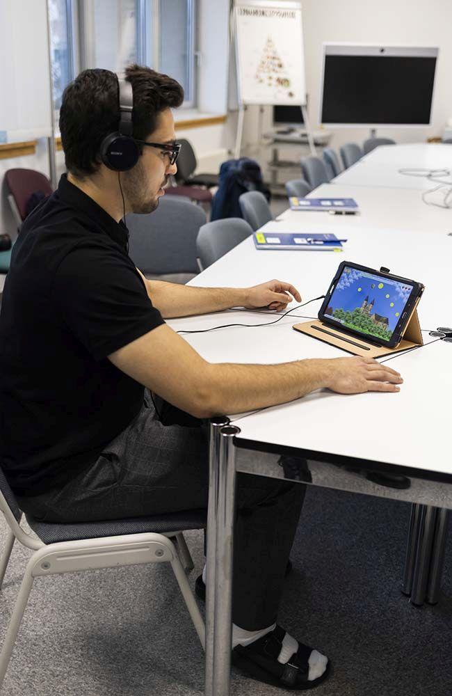 Demonstration der innovativen Einlegesohle: Während einer 15-minütigen Videospiel-Session im Sitzen oder Stehen testeten die Teilnehmenden der Studie ihre Reaktionszeit, ihr Gleichgewicht und ihre Muskelkontrolle.
