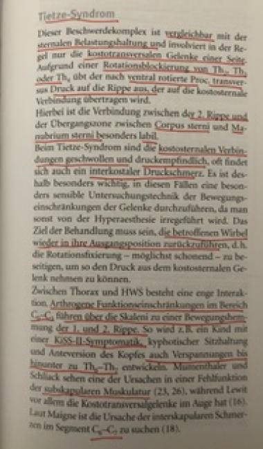 Da Du einen jungen Pat. hast würde ich an der Aufrichtung der Ws (Skoliose- Behandlung) arbeiten. Ich würde auch kontrollieren ob es tatsächlich nur die Ansätzen der 2. Und3. Rippe sind oder mehrere. Titze Syndrom ist häufig eine Verlegenheitsdiagnose für Pat, mit viel Druck auf die vorderen, oberen Rippenansätze.