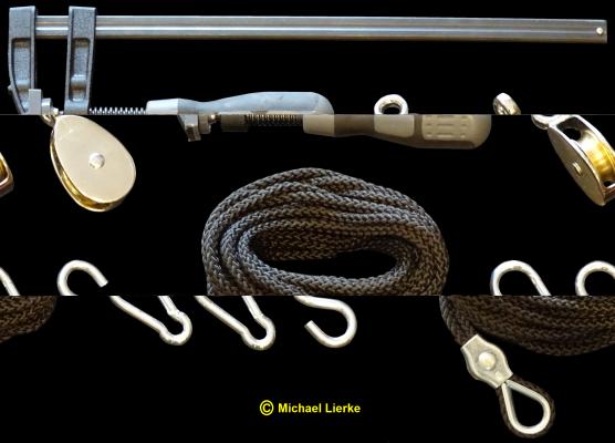 Um nicht mit Therabändern arbeiten zu müssen, kann man mit verhältnismäßig geringem finanziellen Aufwand in der Wohnung des Patienten einen DIY-Seilzug installieren. Diesen kann man sogar als Seilzug mit Mehrfach-Flaschenzug ausführen und ihn, wenn man keine Befestigungsösen in der Decke verankern möchte, auch mit einer einfachen Schraubzwinge in einem Türpfosten befestigen. Als Gewicht kann man z.B. Hantelscheiben mit einem Gurt am unteren Ende befestigen oder große Wasserkanister verwenden, die man zunehmend füllen kann. Einfacher geht es tatsächlich mit Kurzhanteln, deren eine Seite man an der Schnur fixiert, während auf der anderen Seite die angepassten Gewichte aufgeschraubt werden können. Mit dieser einfachen Lösung können zahlreiche Übungen unter schwerkraftentlastung bereits mit sehr kleinem Gewicht durchgeführt werden. Auch Hantelscheiben kann man sich in der Praxis übrigens bevorraten, um diese an Patienten zu verleihen. Es wäre schade, wenn eine derart wirkungsvolle Trainingsmaßnahme an der fehlenden Bereitschaft des Patienten scheitert, sich eine entsprechende Kurzhantel zu kaufen!