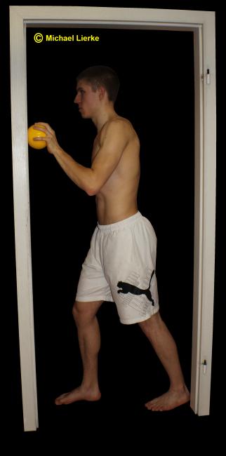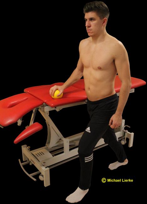 Bereits in einer sehr frühen Phase der Rehabilitation läßt sich die Gelenksicherungsfunktion der Rotatorenmanschette durch isometrische Stütz-, Druck- und Schubübungen innerhalb einer geschlossenen kinetischen Kette anbahnen und später sogar mit hoher Intensität trainieren. Ich verwende hierfür einen einfachen Gymnastikball mit 11 cm Durchmesser, der durch seine Elastizität und seine rutschhemmende Eigenschaft besonders gut zur Stimulation der Muskulatur im Sinne einer gelenkumgreifenden Kontraktion der Rotatoren geeignet ist.