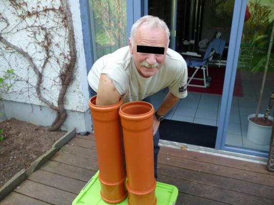 Das Material besteht aus zwei entsprechend gekürzten und mit Abschlusskappen versehenen Kanal-Röhren (160 mm), die mit körperwarmem bzw. eisgekühltem Wasser befüllt werden.